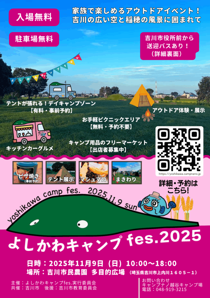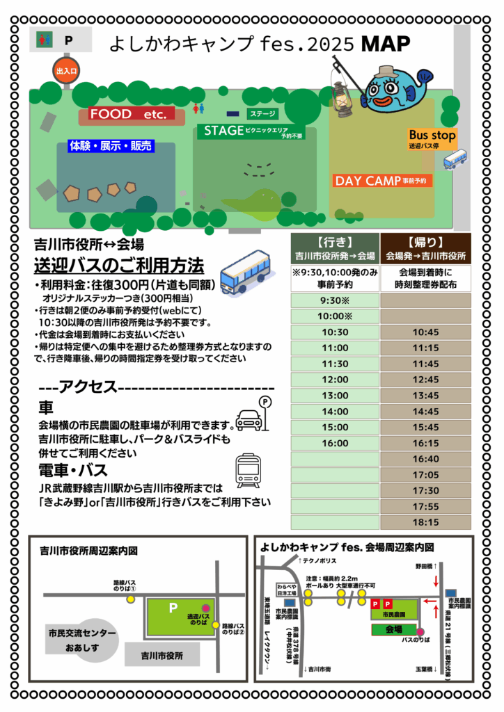 事前予約コンテンツ デイキャンプ ・フリマ区画 詳細ページにて注意事項を確認の上お申し込みください 詳細確認・予約 当日ボランティア【募集中】 当日、お手伝いいただけるボランティアの方を募集しています。 9:00-12:00 12:00-15:00 15:00-19:00デイキャンプと併せてボランティアいただける場合には上部デイキャンプ申込からお願いします。 お手伝いいただいた方には、当日会場で使えるチケットを差しあげます。 ボランティア応募 送迎バス 吉川市役所→会場 ・利用料金:往復300円(片道も同額) オリジナルステッカーつき(300円相当)・代金は会場到着時にお支払いください 9:30発 10:00発 ※行き10:30以降 発は予約不要で先着順にご乗車いただけます ・帰りは特定便への集中を避けるため整理券方式(先着順)となりますので、行き降車後、帰りの時間指定券を受け取ってください 焚き火でピザ焼き体験 【準備中】 焚き火でピザ焼き体験 【準備中】